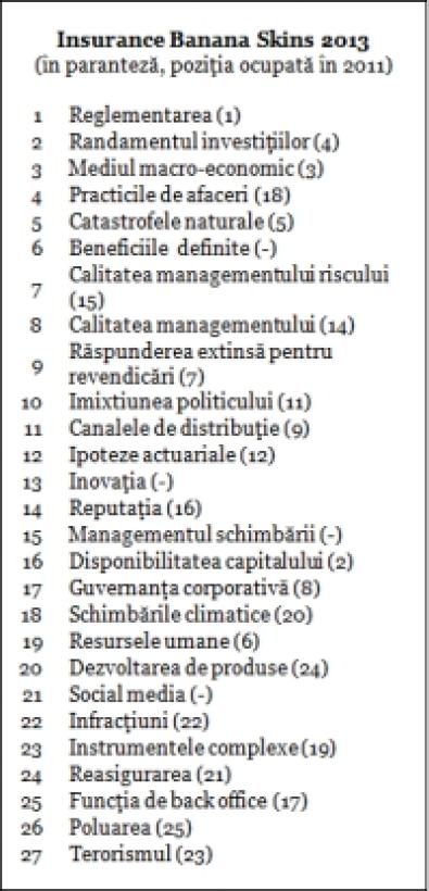 Cel mai recent raport “Insurance Banana Skins”, realizat de către Centrul pentru Studiul Inovaţiei Financiare (CSFI) în colaborare cu PwC, indică faptul că noile reglementări vizând aspecte precum solvabilitatea şi practicile de afaceri ar putea copleşi industria prin costuri şi probleme de conformitate. Ar putea, de asemenea, să distragă managementul de la aspecte mai urgente precum profitabilitatea afacerii într-un moment în care întreaga industrie a asigurărilor se află sub presiune.