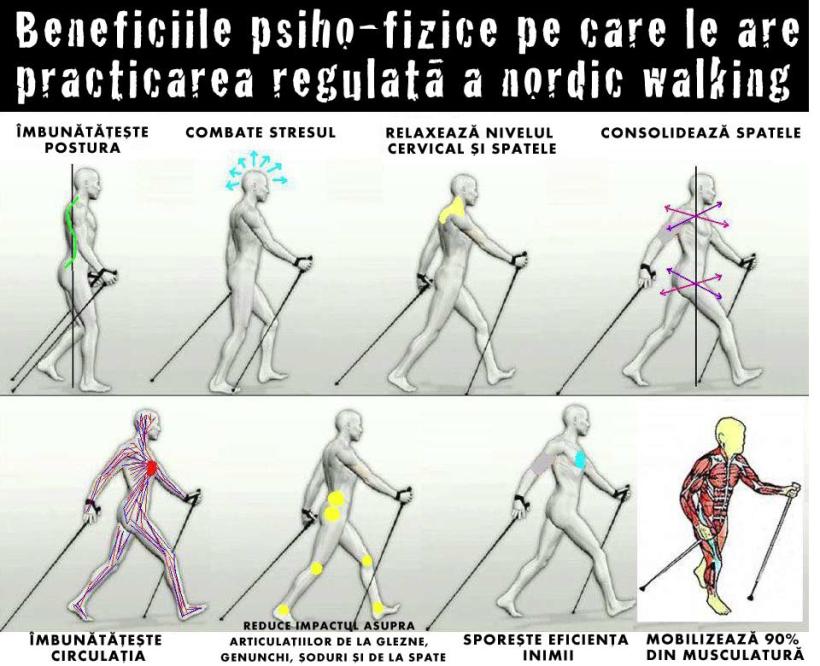 Contactul cu natura scade concentraţia hormonilor de stres iar faptul că se practică în grup, permite relaţionarea cu ceilalți, îmbunătăţeşte starea de spirit, ajutând în combaterea anxietăţii şi depresiei, creşte stima de sine şi dezvoltă creativitatea. Nu în ultimul rând, practicarea mersului nordic ameliorează contractura din zona cervicală şi a umerilor, descarcă tensiunea musculară, protejează organismul de osteoporoză şi osteoartrită prin efortul moderat continuu care stimulează asimilarea calciului în oase şi producţia de elastină şi colagen, întârziind procesul de îmbătrânire.