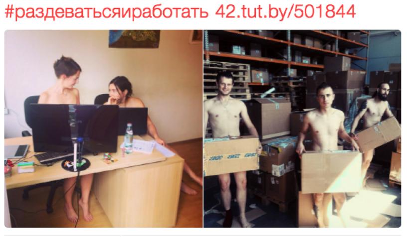 Sub #getnakedandgotowork (#раздеватьсяиработать), oamenii au început să posteze poze cu ei dezbrăcați la locul de muncă, cele mai multe însoțite de comentariul: "Dacă liderul nostru spune că trebuie..."