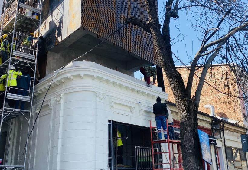 „În 2 ore inginerii Cătălin Stoica ( în foto vesta roșie) și Gabriel Bratu (cu un sul de planșe în mână) au fost în șantier și au evaluat dezastrul. A doua zi dimineață, la ora 7.00, echipa condusă de inginerii Gabriel Cocină, Adrian Giurgiulescu și dl Ilie Beudean și formată din 50 de muncitori au montat jumătate de schelă iar a treia zi tot teatrul era tapat. A patra zi au început structura fațadei de corten iar astăzi, după două săptămâni de lucrat zi lumină, a fost descoperită fațada de la stradă, urmând ca până luni să fie gata și fațada de pe lateral. Și toată această muncă, tot acest efort nebun, toată această dăruire necondiționată a fost făcută PRO BONO”, a continuat Chris Simion-Mercurian.