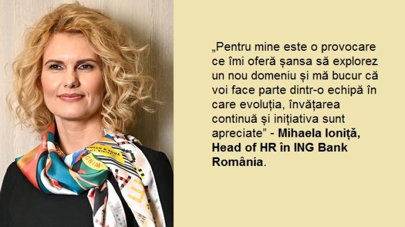 „Sunt încântată să mă alătur echipei ING Bank România, bine-cunoscută pentru profesionalism și creativitate, având astfel oportunitatea de a contribui la dezvoltarea unei culturi organizaționale remarcabile. Pentru mine este o provocare ce îmi oferă șansa să explorez un nou domeniu și mă bucur că voi face parte dintr-o echipă în care evoluția, învățarea continuă și inițiativa sunt apreciate”, a declarat Mihaela Ioniță, Head of HR în ING Bank România.
