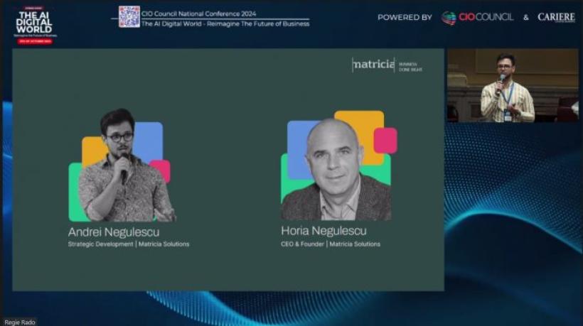 Andrei Negulescu, Strategic Digitalisation Officer, și Horia Negulescu, CEO și Fondator al Matricia Solutions, au susținut împreună o prezentare pe tema "Putting the Business in Digital Transformation". Cei doi au discutat despre importanța factorilor umani în transformarea digitală și despre cum companiile trebuie să se adapteze la mediile dinamice pentru a supraviețui și a prospera într-un peisaj digital în continuă schimbare.