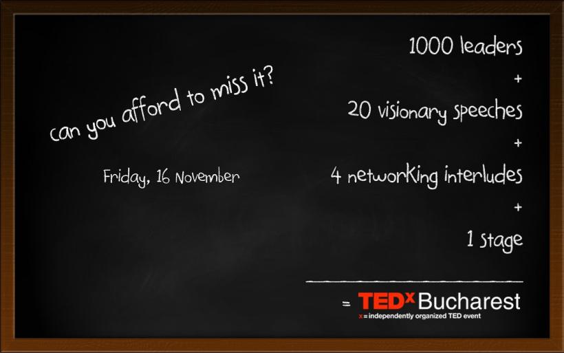Fiecare aspect al conferinței, de la locație, speakeri și agendă până la aranjamentul în sală și activitățile din pauze au fost gândite până în cel mai mic detaliu pentru a vă inspira și motiva. Oamenii activi ai comunității locale, liderii de azi și mâine, se reunesc pe 16 Noiembrie, la Palatul Parlamentului, la TEDxBucharest pentru a asculta cele mai noi idei din tehnologie, arhitectura, design, medicina, antreprenoriat, arta, sport si cultură.