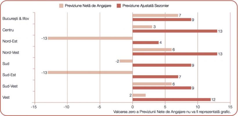 Din punct de vedere regional, Previziunile sunt pozitive pe tot cuprinsul țării, angajatorii din regiunile Centru și Nord-Vest fiind cei mai optimiști, pentru al doilea trimestru consecutiv. Previziunea Netă de Angajare este de +13% în ambele regiuni, rămânând relativ stabilă comparativ cu trim. IV/2015. În regiunea Sud-Vest, Previziunea se îmbunătățește cu 6 puncte procentuale comparativ cu trimestrul în curs, atingând valoarea de +9%, una din cele mai optimiste din ultimii patru ani. În schimb, Previziunea Netă de Angajare din regiunea Nord-Est slăbește cu 9 puncte procentuale și atinge +4%, valoare care, deși pozitivă, este cea mai puțin optimistă din întreaga țară.