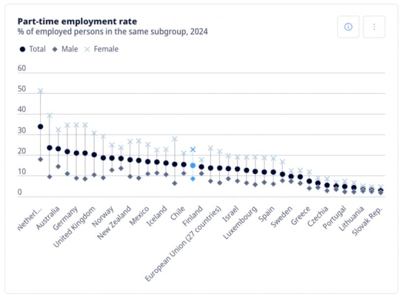 Țările de Jos se află pe primul loc, cu peste 30% din totalul angajaților care part-time, în rândul țărilor aflate într-o analiză a OECD. Australia și Germania urmează, ambele cu procente peste 20%, ceea ce confirmă o preferință structurată pentru flexibilitate și echilibru viață-muncă.