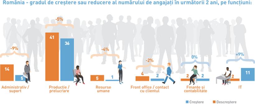 Totuși, 17% dintre angajatorii români consideră că automatizarea îi va determina să-și scadă numărul total de angajați în următorii doi – trei ani, față de doar 10% la nivel global, și doar 14% consideră că-și vor mări numărul de angajați în urma robotizării, față de 20% la nivel global, impactul net per ansamblu fiind unul ușor negativ.