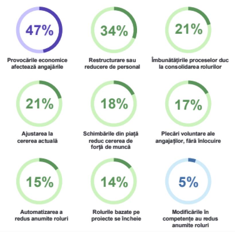 „Aproape jumătate dintre angajatorii români care preconizează scăderi în numărul de angajați spun că incertitudinea economică este principala barieră. Peste o treime au în plan procese de restructurare”, se mai arată în raportul menționat.