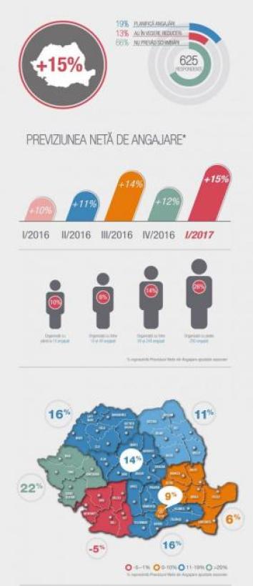 În intervalul ianuarie - martie 2017 este de așteptat ca numărul total de angajați să crească în opt dintre cele 10 sectoare de activitate analizate și în șapte din cele opt regiuni ale țării. Industria prelucrătoare formulează și de această dată cea mai puternică prognoză din toate cele raportate la nivel de sector, Previziunea Netă de Angajare de +33% consolidându-se cu 1 punct procentual comparativ cu trimestrul IV/2014 și cu 13 puncte procentuale comparativ cu trim. I/2016, cea mai semnificativă îmbunătățire de la an la an raportată în această ediție a studiului.