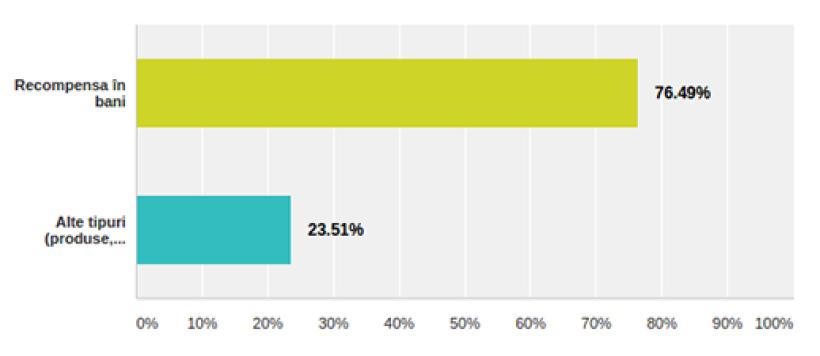 76,2% dintre companii folosesc banii ca remunerație în cazul recrutării bazate pe recomandări, iar 23,8% dintre angajatori aleg alte tipuri de stimulente: produse, abonamente la diferite servicii, tichete de masă, excursii, bonusuri.