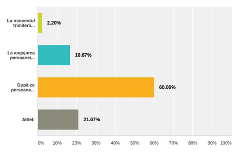 Recomandări joburi. 60% dintre angajatorii respondenți spun că banii ajung la persoana care a făcut recomandarea după ce persoana angajată își încheie cu succes perioada de probă, în timp ce 20% apelează la diverse alte metode: jumătate din sumă la angajarea persoanei recomandate, jumătate după ce candidatul își încheie cu succes perioada de probă; după 6 luni de la angajare sau fracționat: la o lună, 3 și 6 luni.