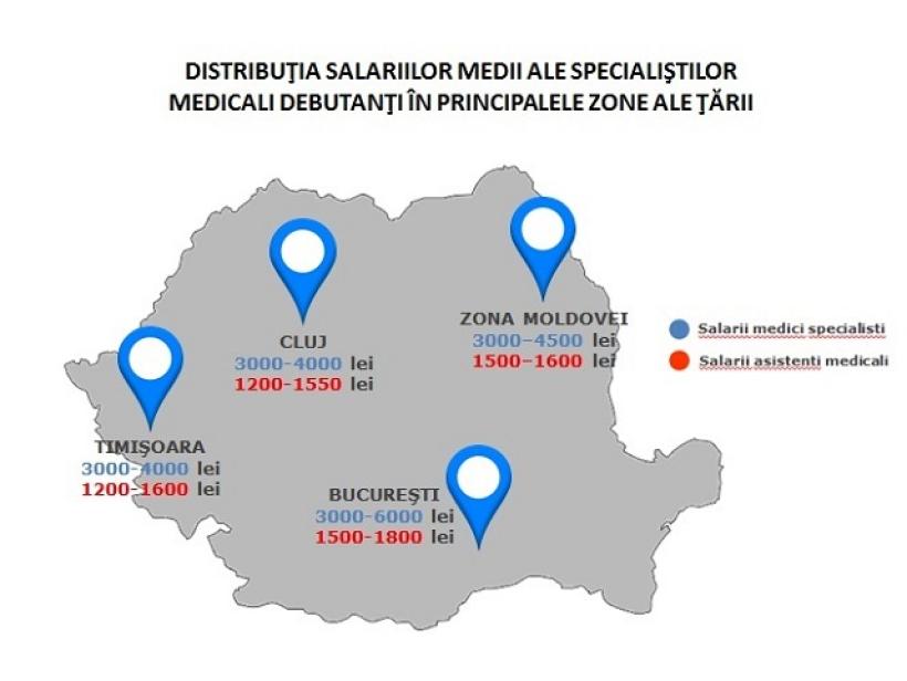 În funcție de zona în care aceștia aleg să profeseze apar și diferențe între salariile medicilor fără experiență. „Media salariilor medicilor specialiști din Moldova se ridică peste media țării, în jurul pragului de 4000 de lei. Acest lucru se datorează faptului că această parte a țării suferă de un deficit de medici fără precedent. Acest lucru îi determină pe angajatorii din sistemul privat de sănătate să mărească nivelul salariului de debut, pentru a atrage cât mai mulți candidați competenți. În Centrul și Vestul țării, salariile medicilor debutanți se încadrează, în general, în media pieței” menționează autorii studiului.
