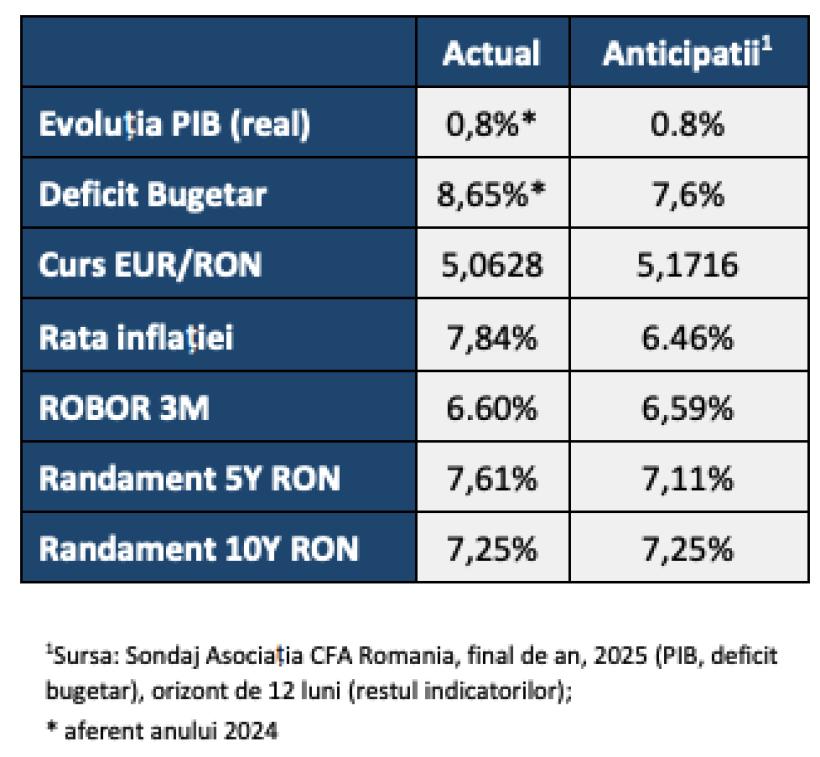 Încrederea în economie rămâne scăzută, chiar dacă există unele semne de revenire. În tot acest timp, inflația este așteptată să crească din nou, leul să se deprecieze, iar discuțiile despre ratingul de țară și stabilitatea financiară rămân în prim-plan, potrivit unui studiu realizat de Asociația CFA România. Specialiștii subliniază că există și riscul intrării în recesiune.