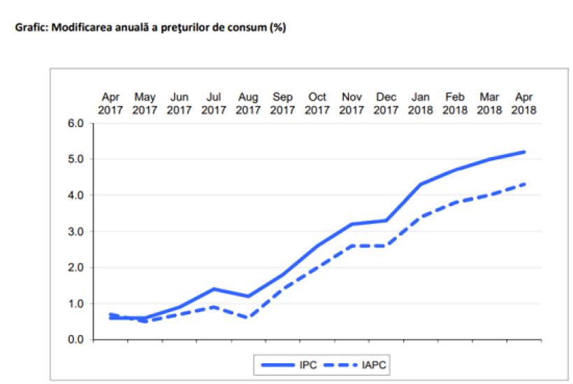 Potrivit INS, rata medie a inflaţiei în ultimele 12 luni (aprilie 2017 - aprilie 2018) faţă de precedentele 12 luni (aprilie 2016 - aprilie 2017), calculată pe baza IPC, a fost de 2,8%.
