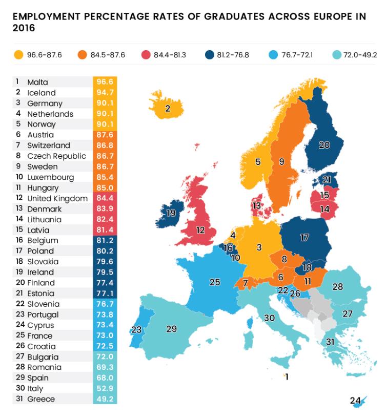 În contrast, țările europene cu cel mai mic număr de angajări după absolvire sunt următoarele: Bulgaria (72%), România (63%), Spania (68%), Italia (52.9%) și Grecia (49.2%).