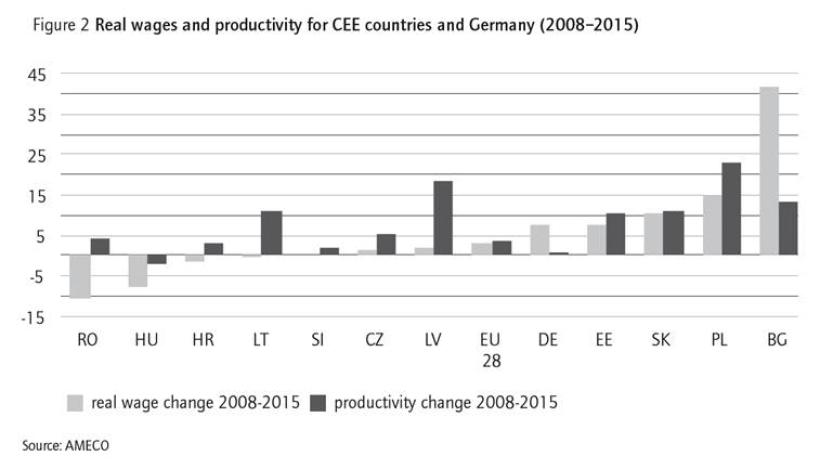- productivitatea a crescut mai mult decât salariile reale (ajustate în funcție de inflație) în Polonia, Republica Cehă, Slovacia, Letonia, Slovenia și Estonia;