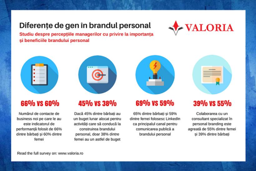 Principalul indicator performanță, în funcție de care își măsoară progresul în construirea brandului personal ambele sexe, este numărul de contacte de business noi pe care le au - bărbații (66%), femeile (60%). Acesta este urmat de numărul de evenimente la care participă într-o lună (29%) în cazul femeilor și de numărul de contacte pe LinkedIn (35%), în cazul bărbaților, sondajul evidențiind natura socială a femeilor și cea pragmatică a bărbaților.