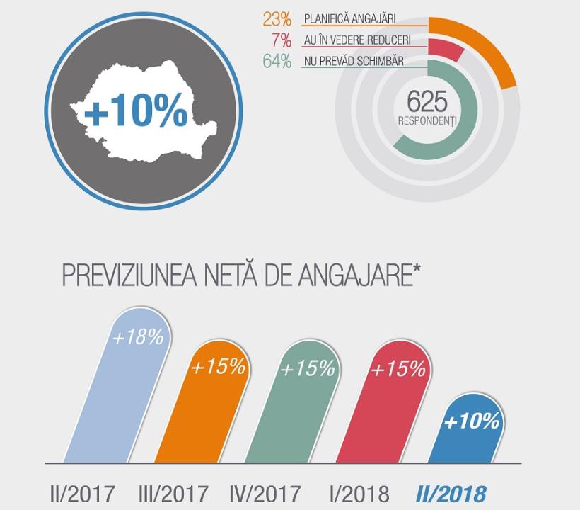 În opt din cele zece sectoare de activitate analizate, angajatorii au planuri de creștere a numărului total de angajați, dar perspectivele sunt mai slabe decât în trim. I/2018, în toate cele zece sectoare.