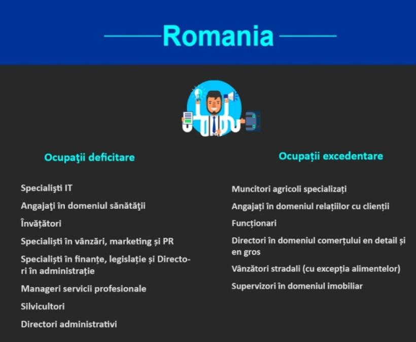 Raportul arată că în România există o lipsă relativă a specialiștilor IT, a doctorilor și a asistentelor, managerilor din domeniul serviciilor, a profesioniștilor din domeniul financiar, marketing și relații publice. În același timp, există un excedent în cazul angajaților care lucrează cu clienții, manageri în domeniul comerțului și funcționari.