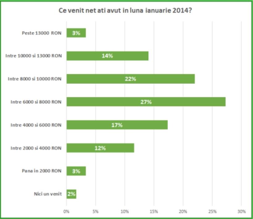 Potrivit rezultatelor sondajului desfășurat în perioada 10 – 18 februarie, 49% dintre respondenți au afirmat că au venituri cuprinse între 6.000 de lei și 10.000 de lei, iar 17% încasează lunar remunerații ce depășesc 10.000 lei. Majoritatea respondentilor sunt din București, iar principalele domenii în care lucrează aceștia sunt IT, Telecom și Financiar/Bancar.