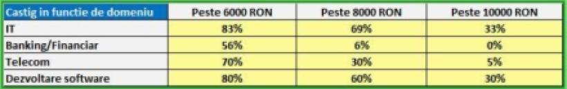 În funcție de domeniile în care managerii de proiect primesc cele mai mari salarii, pe prima poziție se regăsește, cum era de așteptat, IT-ul unde 69% dintre respondenți au declarat că au venituri lunare de peste 8.000 de lei.
