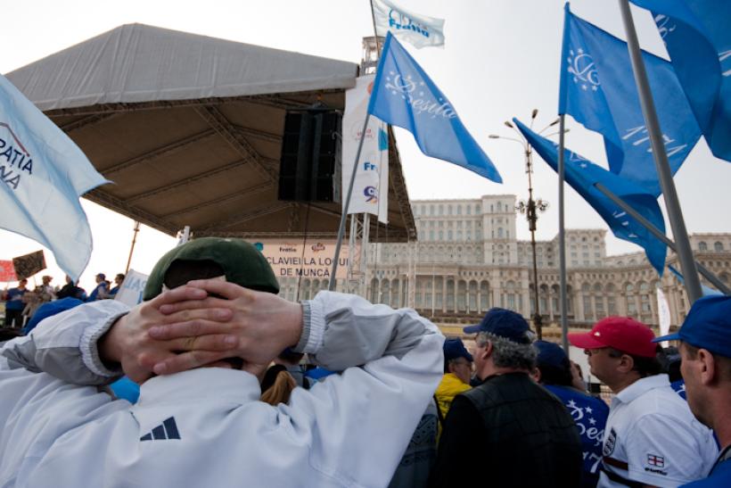 Liderii sindicali s-au adresat multimii de pe o scena instalata in fata Casei Poporului, declarand ca o solutie impotriva guvernului Boc este greva generala. Manifestantii aveau bannere pe care scrie "Salvaţi Codul Muncii", "Jos sclavia lui Basescu! Ne intoarcem la Ceausescu?", "Basescu, Boc, Romania / Codul muncii e sclavia; sa va scufundaţi bine!".