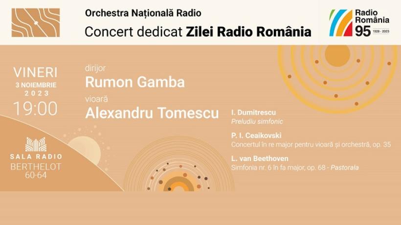 În acest an, concertul aniversar prezentat de Orchestra Națională Radio va avea loc vineri, pe 3 noiembrie 2023 (de la 19.00), la Sala Radio, și îl va avea ca solist pe apreciatul violonist Alexandru Tomescu. Acesta va interpreta Concertul în re major pentru vioară și orchestră de Ceaikovski. Celebra lucrare a reprezentat sursa de inspirație a peliculei cinematografice „Concertul” (2009), în regia lui Radu Mihăileanu.