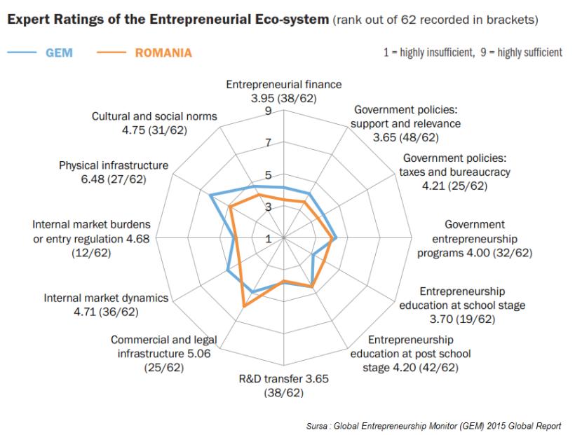 Aproape un sfert dintre adulții din cele 60 de țări care au participat la raportul Global Entrepreneurship Monitor (GEM) intenționează să înceapă o afacere în următorii trei ani. Procentul este de 29% în România, ceea ce o situează pe locul 16 în lume și mult peste media europeană de 12,8%. Se înregistrează însă o ușoară scădere față de 2014, când 32 % dintre românii de peste 18 ani erau interesați să se lanseze în afaceri. În paralel, implicarea guvernului rămâne foarte redusă: locul 48 din 62 în ceea ce privește programele și politicile de sprijinire a antreprenoriatului.
