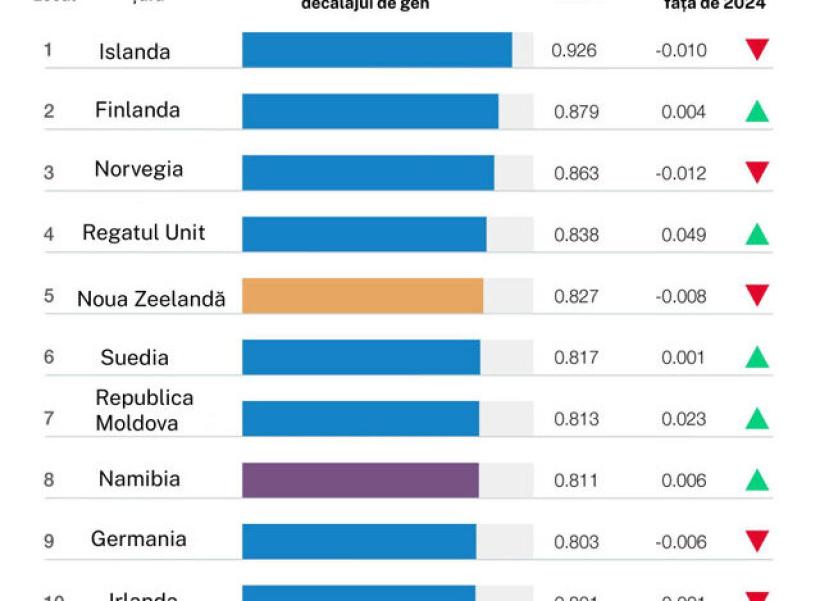 - Islanda (92,6%, locul 1) conduce pentru al 16-lea an consecutiv și este singura economie care a închis peste 90% din decalajul de gen.
