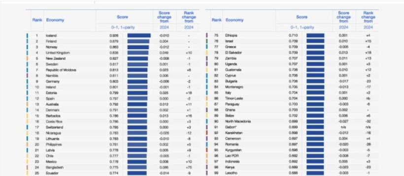 Nicaragua (78,3%, locul 18) și Spania (79,7%, locul 12) ies din top 10 în comparație cu ediția din 2024.