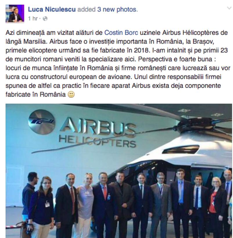 „I-am întâlnit și pe primii 23 de muncitori români veniți la specializare aici. Perspectiva e foarte bună : locuri de muncă înființate în România și firme românești care lucrează sau vor lucra cu constructorul european de avioane. Unul dintre responsabilii firmei spunea de altfel că, practic, în fiecare aparat Airbus exista deja componente fabricate în România”, a scris pe contul personal ambasadorul României în Franța, Luca Niculescu.