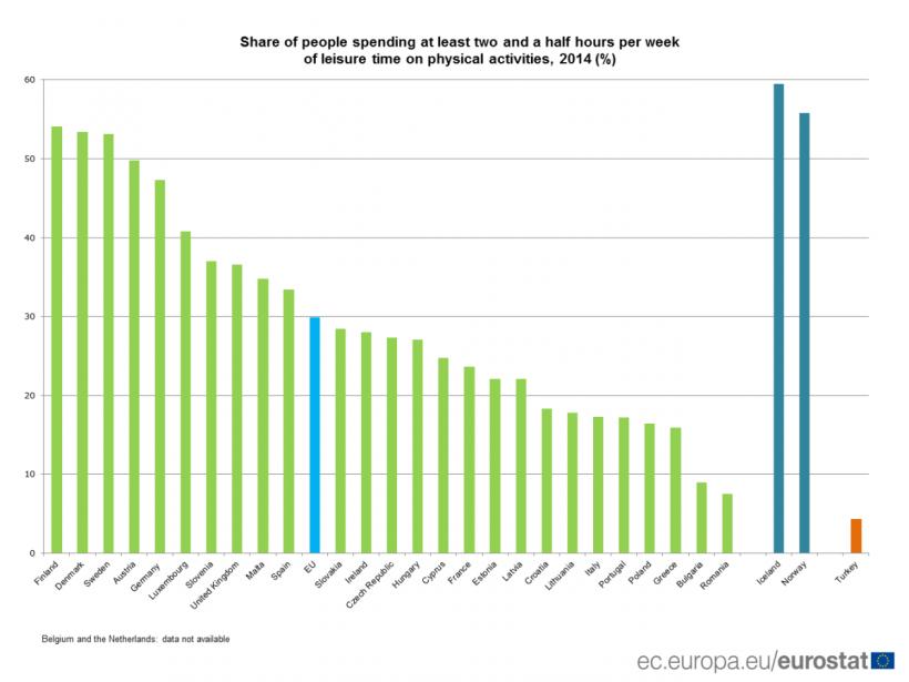 În UE, cei mai mulți oameni care fac mișcare cel puțin două ore și jumătate pe săptămână sunt în Finlanda (54,1%), Danemarca (53,4%) și Suedia (53,1%). Urmează în clasament Austria, Germania și Luxemburg. Dintre vecinii României, cea mai bine clasată este Ungaria, unde aproape 30% dintre cetățeni practică sportul în timpul liber.