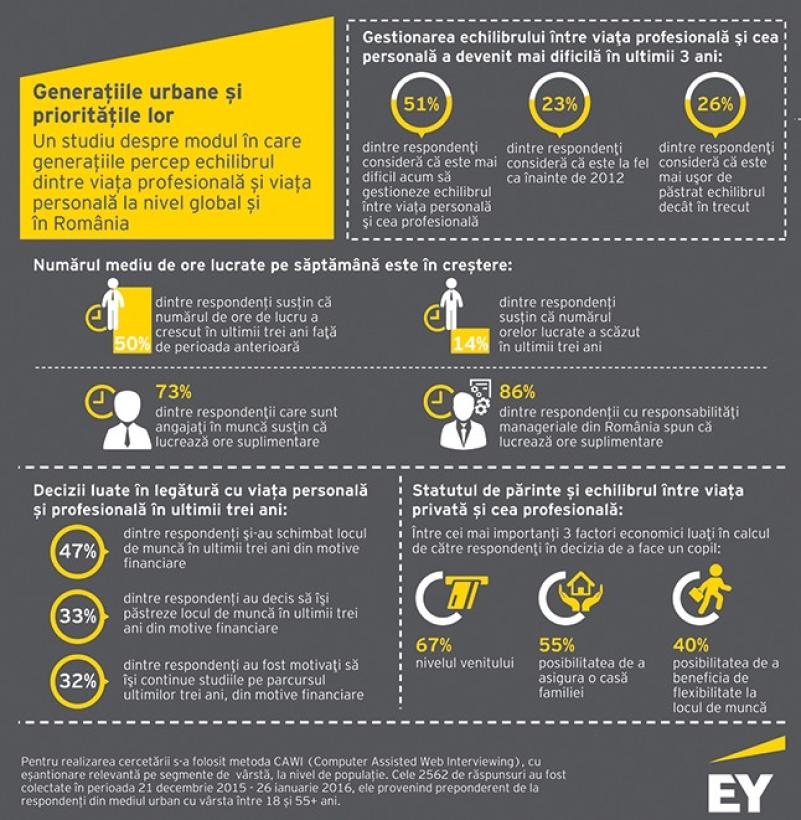 EY a realizat acest studiu în contextul schimbărilor rapide care au loc în întreaga lume şi a diferenţelor de abordare între generaţiile care sunt în prezent active pe piaţa muncii. Scopul acestei analize este de a înţelege modul în care generaţiile urbane din România gestionează echilibrul între viaţa personală şi cea profesională, dar şi tendinţele specifice generaţiilor din România, în comparaţie cu celelalte ţări analizate de EY la nivel global.