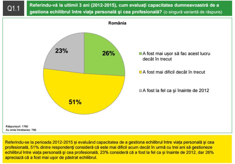 Peste jumătate (51%) dintre respondenţi consideră că este mai dificil acum decât în urmă cu trei ani să gestioneze echilibrul între viața personală şi cea profesională, în timp ce 26% apreciază că este mai uşor de păstrat echilibrul în prezent.
