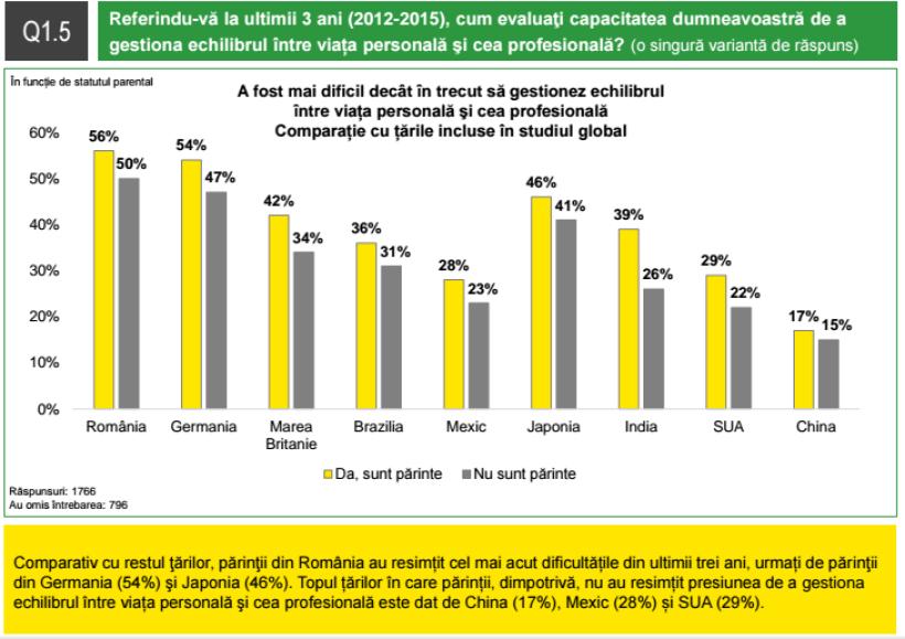 Cei care au copii au resimţit într-o măsură mai mare dificultatea gestionării echilibrului între viaţa personală şi cea profesională în ultimii trei ani – 56% dintre respondenţii care sunt părinți spun că a fost mai dificil să facă acest lucru, în comparație cu 50% dintre cei care nu au copii. Comparativ cu restul ţărilor, părinţii din România au resimțit cel mai acut dificultățile din ultimii trei ani, urmați de părinţii din Germania (54%) şi Japonia (46%).