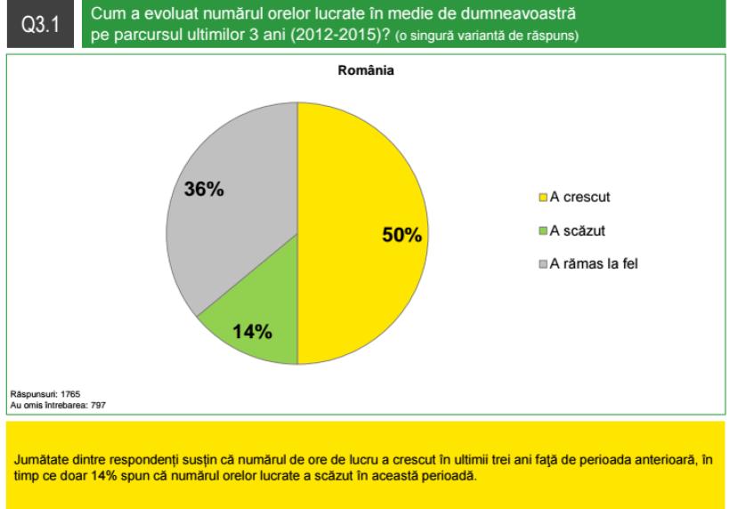 Jumătate dintre respondenți susțin că numărul de ore de lucru a crescut în ultimii trei ani faţă de perioada anterioară, în timp ce doar 14% spun că numărul orelor lucrate a scăzut în această perioadă. Cel mai mult resimt creșterea numărului de ore de lucru cei din generaţia Y (52%), în timp ce jumătate dintre cei din generaţia Boomers spune că numărul orelor lucrate a rămas constant pe parcursul ultimilor trei ani.