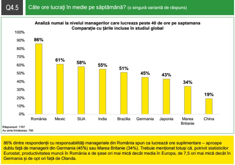 De asemenea, peste 70% dintre respondenţii care sunt angajaţi în muncă susţin că lucrează ore suplimentare, iar 34% lucrează chiar mai mult de 46 de ore pe săptămână.