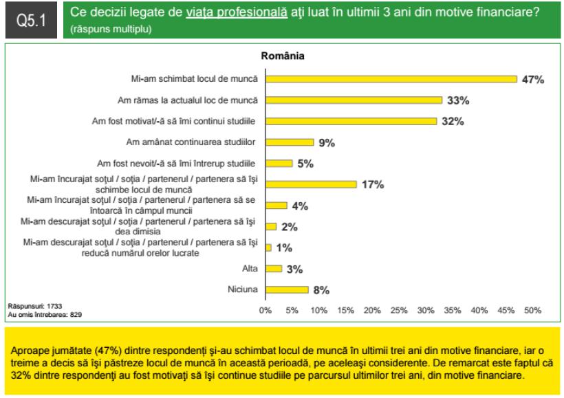 Aproape jumătate dintre respondenții angajați în muncă au renunțat la activitățile de relaxare din motive financiare în ultimii trei ani, în timp ce 28% au amânat achiziționarea sau închirierea unei locuinţe personale, iar 14% au amânat decizia de a avea primul copil din aceleași motive. 14% dintre respondenții cu vârsta între 34 şi 49 de ani au amânat decizia de a avea primul copil din motive financiare, iar 6% dintre ei pe aceea de a avea încă un copil.