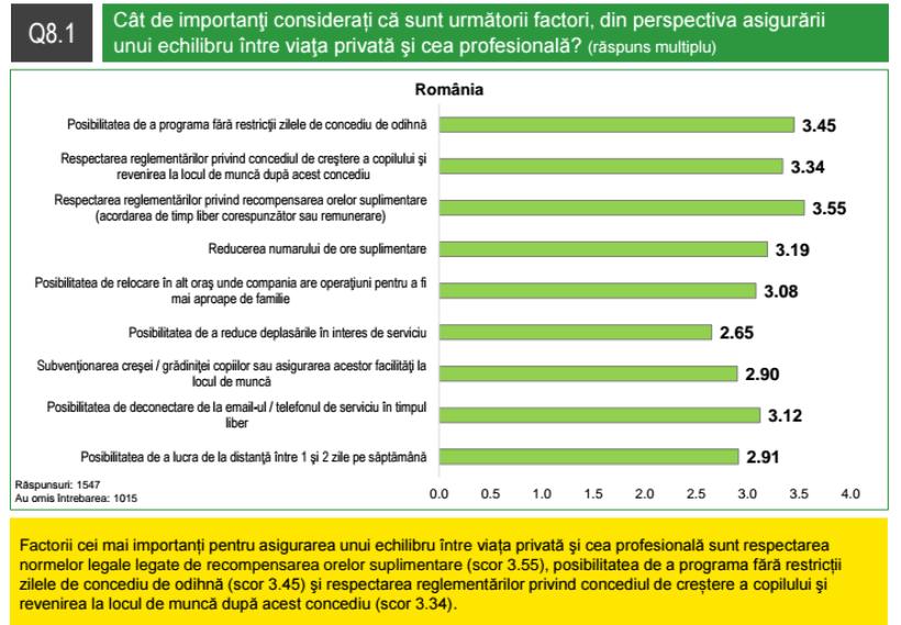 Factorii cei mai importanți pentru asigurarea unui echilibru între viața privată şi cea profesională sunt respectarea normelor legale legate de recompensarea orelor suplimentare (61%), posibilitatea de a programa fără restricții zilele de concediu de odihnă (54%) şi respectarea reglementărilor privind concediul de creștere a copilului şi revenirea la locul de muncă după acest concediu (46%).