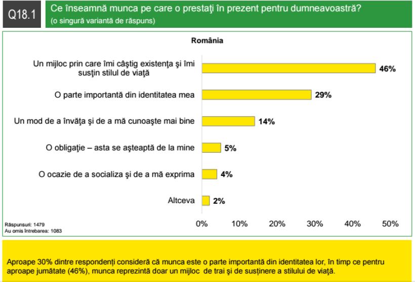Aproape 30% dintre respondenți consideră că munca este o parte importantă din identitatea lor, în timp ce pentru aproape jumătate (46%), munca reprezintă doar un mijloc de trai şi de susținere a stilului de viaţă.