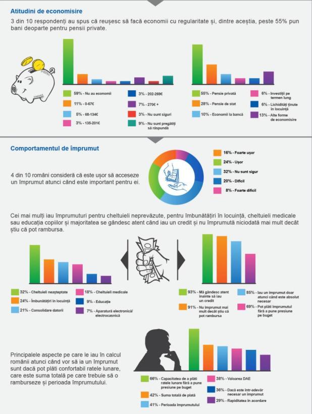 Aproape 40% dintre respondenții români consideră facil să acceseze un împrumut atunci când este important pentru ei. Mai mult, 93% spun că se gândesc foarte atent înainte de a lua un credit, iar 91% împrumută doar sume de bani potrivite situației lor financiare, pe care le pot rambursa fără a pune presiune pe buget. 43% dintre participanții la studiu declară că susțin cheltuielile zilnice cu mai multă ușurință decât în 2014 și 28% spun că sunt mai prudenți. Cei mai mulți dintre ei iau împrumuturi pentru cheltuieli neașteptate, pentru îmbunătățiri în locuință, cheltuieli medicale sau pentru educația copiilor. Principalele aspecte pe care clienții le iau în calcul atunci când vor să ia un împrumut sunt capacitatea de a plăti confortabil ratele lunare (66%), suma totală pe care trebuie să o ramburseze (42%) și perioada împrumutului (41%).