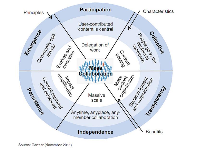 Gartner a identificat şase principii de bază care delimitează social media de la alte modalităţi de comunicare şi colaborare, formând baza pentru propunerea unei valori unice prin mass-collaboration. Liderii din business ar trebui să aplice aceste principii pentru a face trecerea de la "a furniza şi a se ruga" la o abordare prin care să motiveze strategia şi apoi să-şi asume răspunderea pentru strategie.