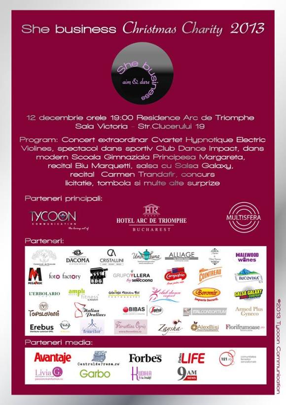 Este primul eveniment de Crăciun al clubului şi este, parțial, caritabil în favoarea unei doamne şi a celor 3 copii ai săi, cărora She Business doreşte să le ofere dreptul la o nouă viaţă. În felul acesta, clubul se declară încă o dată un luptător antiviolenţă domestică, o problematică încă foarte gravă a societăţii noastre.