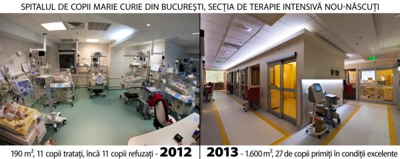 Noua secţie de terapie intensivă nou-născuţi de la Spitalul Marie Curie dispune acum de încăperi individuale pentru fiecare pacient, dotate cu gaze medicale, climatizare şi monitorizare individuală, spaţii speciale pentru părinţi, dar şi de un spaţiu de training, spaţii pentru personalul medical, pentru consilierea psihologică a părinţilor, precum şi săli de consultaţie.