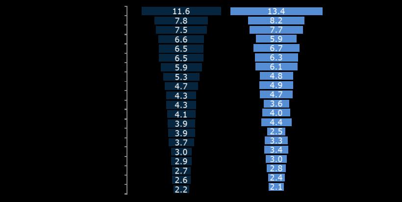 Din punct de vedere al notorietăţii pe domenii, în top zece apar FMCG, Retail, Telecomunicații și Financiar, la polul opus situându-se Construcțiile, Audit & Consultanță și Agricultură.