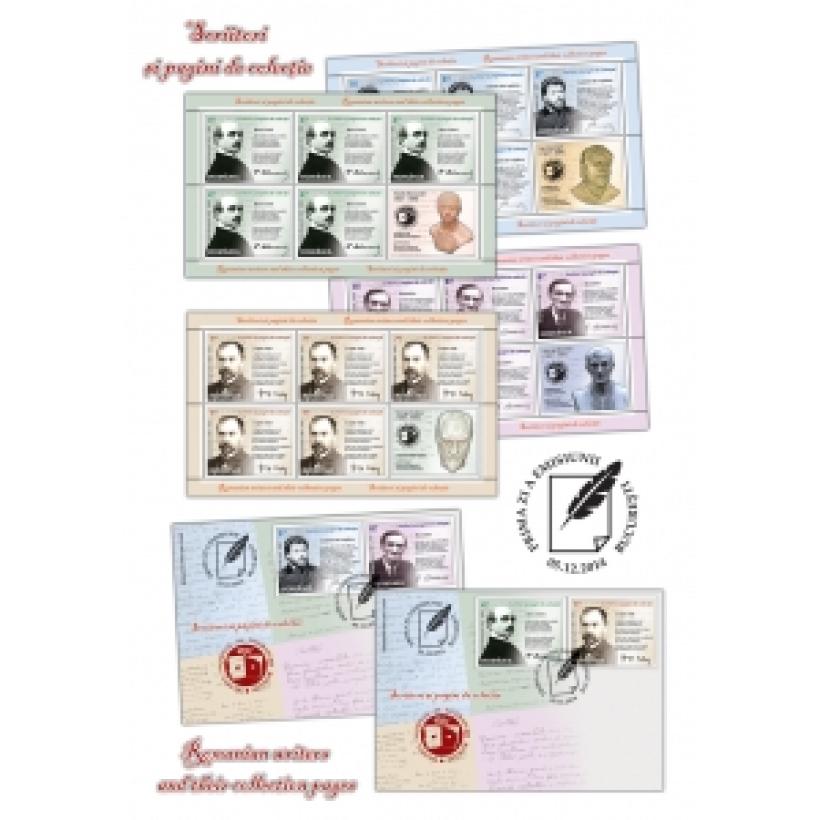 Intitulată „Scriitori și pagini de colecție”, emisiunea filatelică este alcătuită din patru timbre pe care sunt reprezentate portretele a patru scriitori, împreună cu un mic fragment din opera lor și semnătura fiecăruia, potrivit unui comunicat de presă.