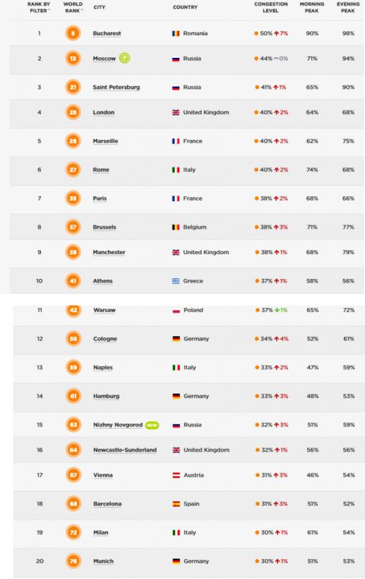 Revenind la topul celor mai aglomerate oraşe din Europa, după Bucureşti se află Moscova, cu un grad de congestionare de 44% şi Sankt Petersburg (41%), ambele din Rusia.