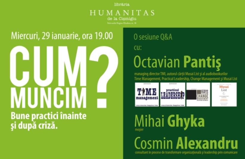 Cum muncim? O întrebare care poate avea nenumărate răspunsuri. Dar probabil că cele mai bune le veți afla miercuri, 29 ianuarie, de la ora 19.00, când la librăria Humanitas de la Cişmigiu va avea loc o întâlnire cu Octavian Pantiş, managing director TMI, Mihai Ghyka, moşier şi fost director comercial pe segmentul consumer în cadrul Vodafone, şi Cosmin Alexandru, consultant în procese de transformare organizaţională şi leadership prin comunicare.