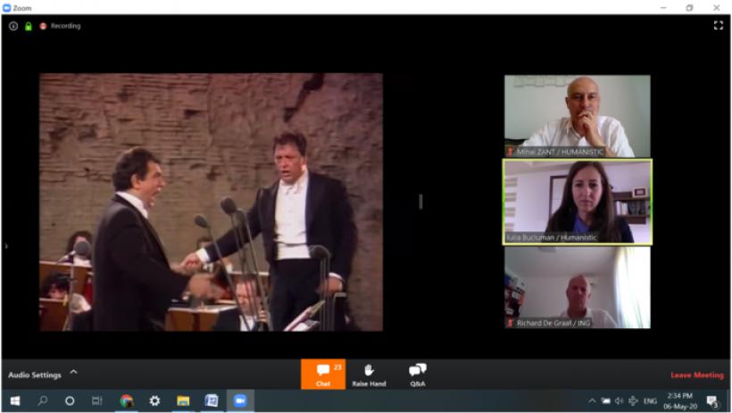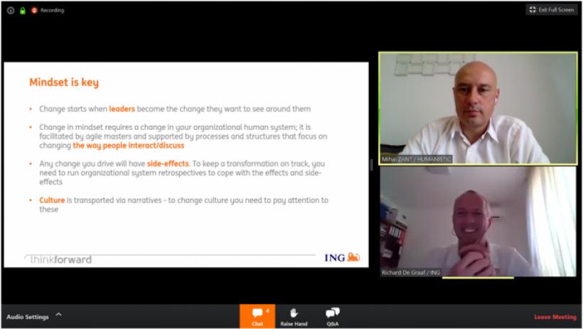 ”A fost minunat să pot împărtăși experiența ING Bank în ceea ce privește schimbările care au avut loc pe fast forward în această perioadă și cum am ajuns de la o medie de 14% la peste 95% pondere de work from home în doar câteva zile, fără a afecta activitatea băncii, cu atât mai mult cu cât am lansat și noi servicii și funcționalități. Acest lucru a fost posibil, în primul rând, datorită angajaților noștri care au adoptat mindset-ul Agile, își asumă în fiecare zi responsabilități și fac lucrurile să se întâmple pentru clienții noștri, precum și datorită orientării digitale a modelului de business al băncii. Și pentru că am văzut că funcționează, am hotărât să mărim procentul de lucru de acasă, până la 40%, când revenim la vremuri mai bune. De asemenea, am derulat diverse programe pentru a crește motivația angajaților noștri, de la playlist-ul Spotify creat de aceștia și mixat de un DJ la radio, cu scop caritabil, webinarii pe diverse teme și pagini de jurnal în izolare, până la sesiuni de sport și nutriție și concursuri distractive”, și-a încheiat prezentarea Richard de Graaf.