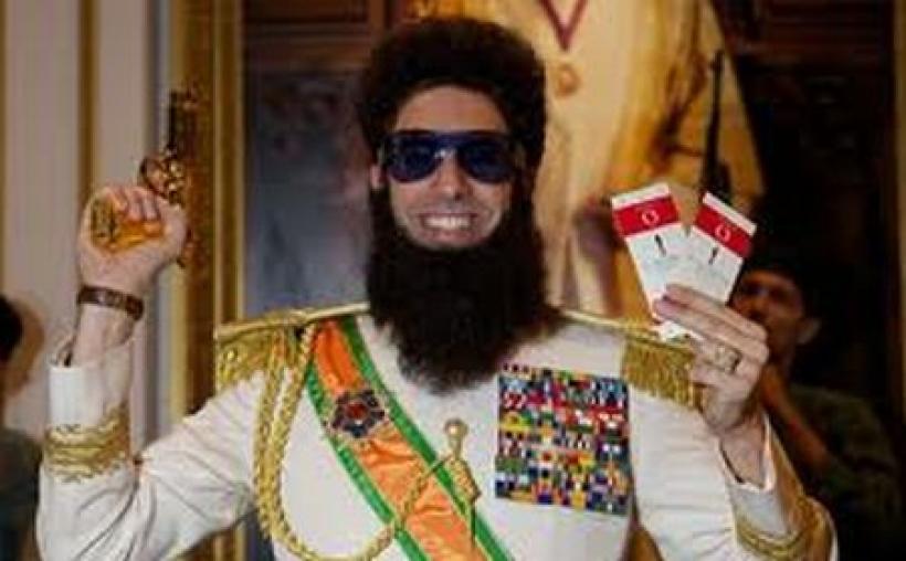 Actorul a venit imbracat in costumul pe care l-a purtat in filmul The Dictator. Acesta a facut o gluma macabra, aducand cu el si o urna, in care a afirmat ca acolo are cenusa fostului lider nord coreean, Kim Jong Il. Pana la urma, a varsat-o peste jurnalistul care ii lua interviul. El a fost flancat pe parcursul intregii ceremonii de doua femei bodyguard.