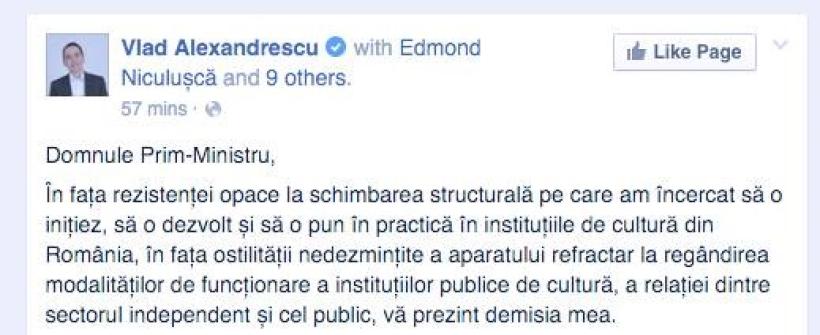 „Domnule Prim-Ministru, în fața rezistenței opace la schimbarea structurală pe care am încercat să o inițiez, să o dezvolt și să o pun în practică în instituțiile de cultură din România, în fața ostilității nedezmințite a aparatului refractar la regândirea modalităților de funcționare a instituțiilor publice de cultură, a relației dintre sectorul independent și cel public, vă prezint demisia mea” a scris Vlad Alexandrescu pe facebook.